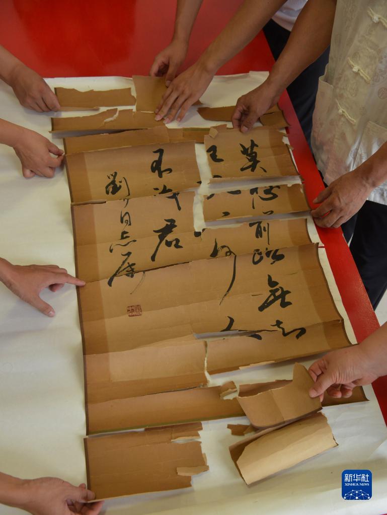 8月7日,河北省石家庄市书画文物揭裱修复师胡凌波带领学生研究一幅待修复的书法作品。