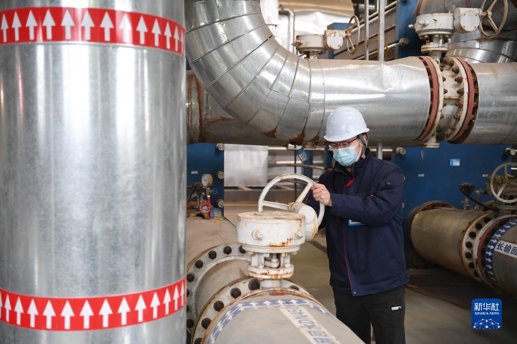 11月10日,在石家庄市一家供热企业,工作人员在运行车间内检查供暖设备。