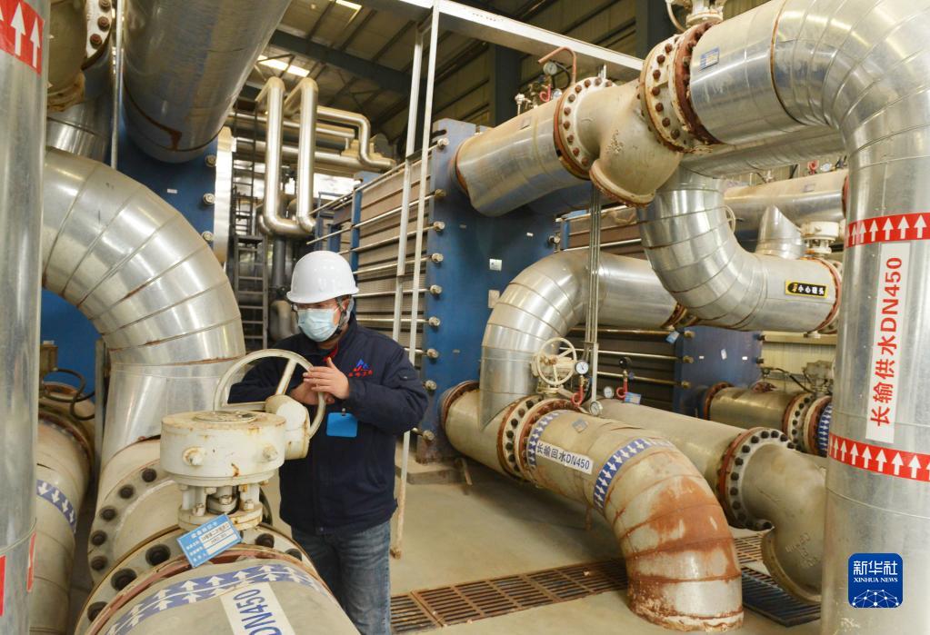 11月10日,在石家庄市一家供热企业,工作人员在运行车间内调控设备。