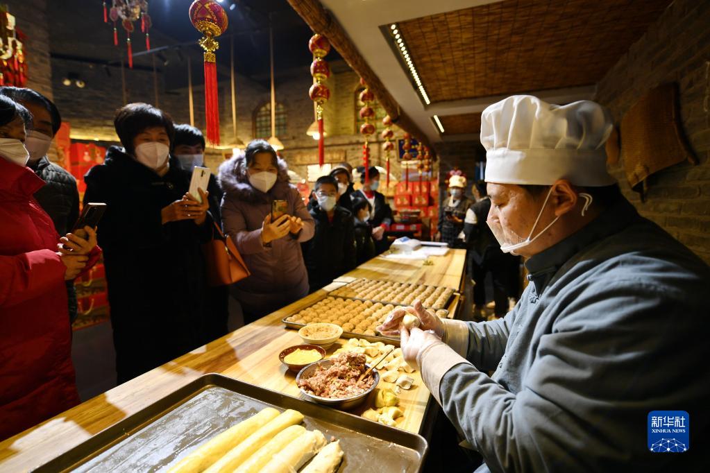 1月12日,河北省唐山市丰润区棋子烧饼制作技艺非遗传承人谷小光(右一)在“非遗”年货节现场制作棋子烧饼。