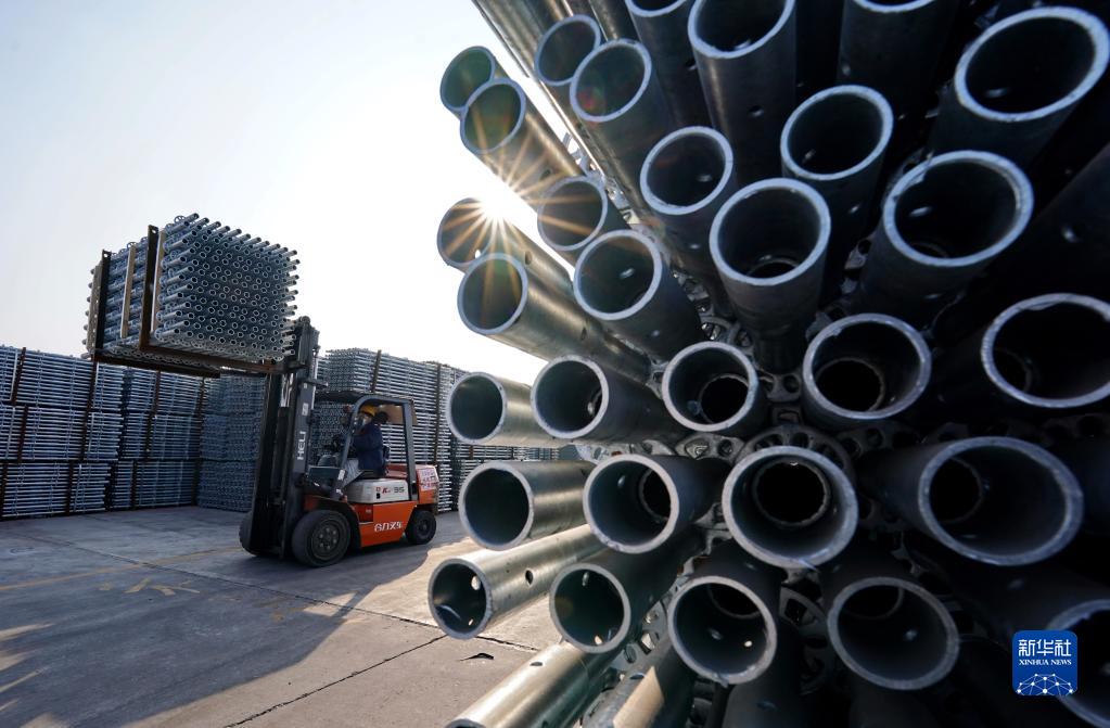 2月10日,唐山市海港经济开发区一家支护装备企业的工人驾驶叉车码放产品。