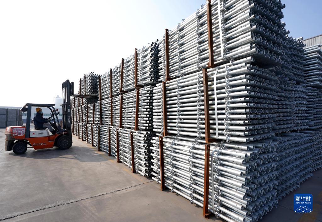 2月10日,唐山市海港经济开发区一家支护装备企业的工人驾驶叉车码放产品。