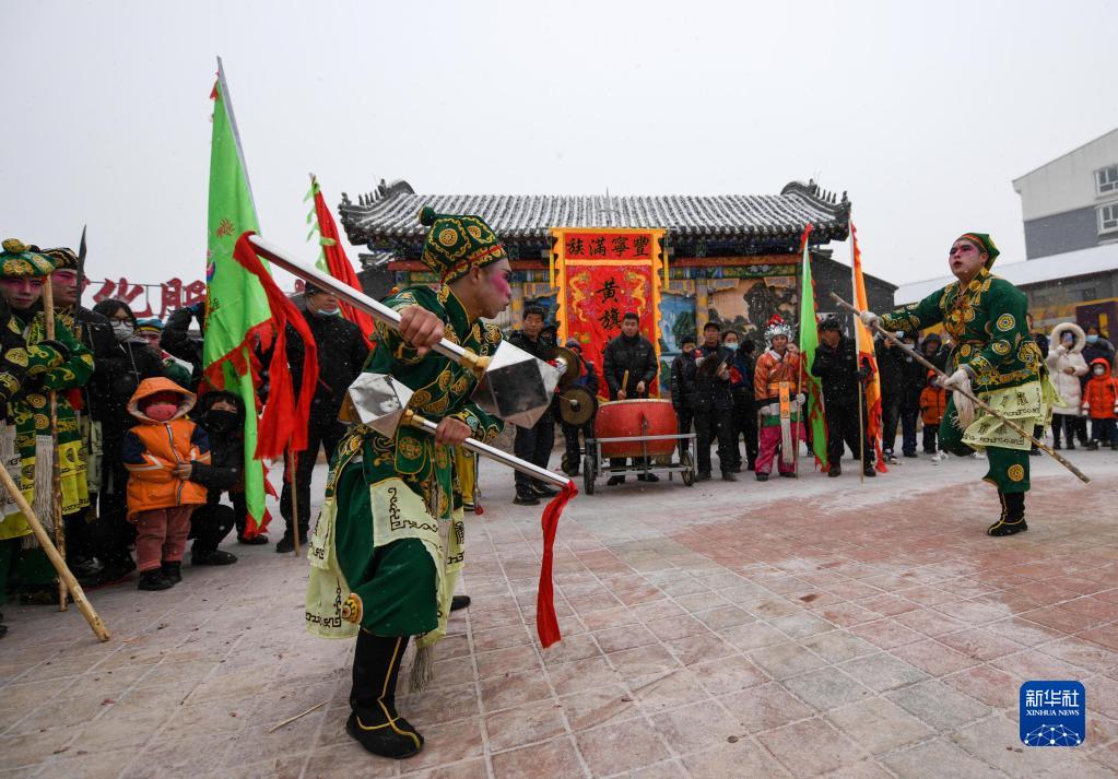 元宵节将至,河北省丰宁满族自治县黄旗镇黄旗东村热闹非凡,民间艺人在村内文化广场表演有着悠久历史的省级非遗项目“黄旗武会”,喜迎元宵佳节到来。 “黄旗武会”是一种独具特色的民间艺术表演形式,表演以传统武术为基础,以锣鼓伴奏,颇具观赏性。新华社发(王立群 摄)
