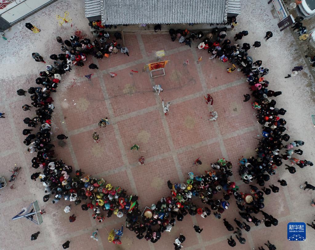 2月13日,在丰宁县黄旗镇黄旗东村文化广场,民间艺人表演“黄旗武会”(无人机照片)。