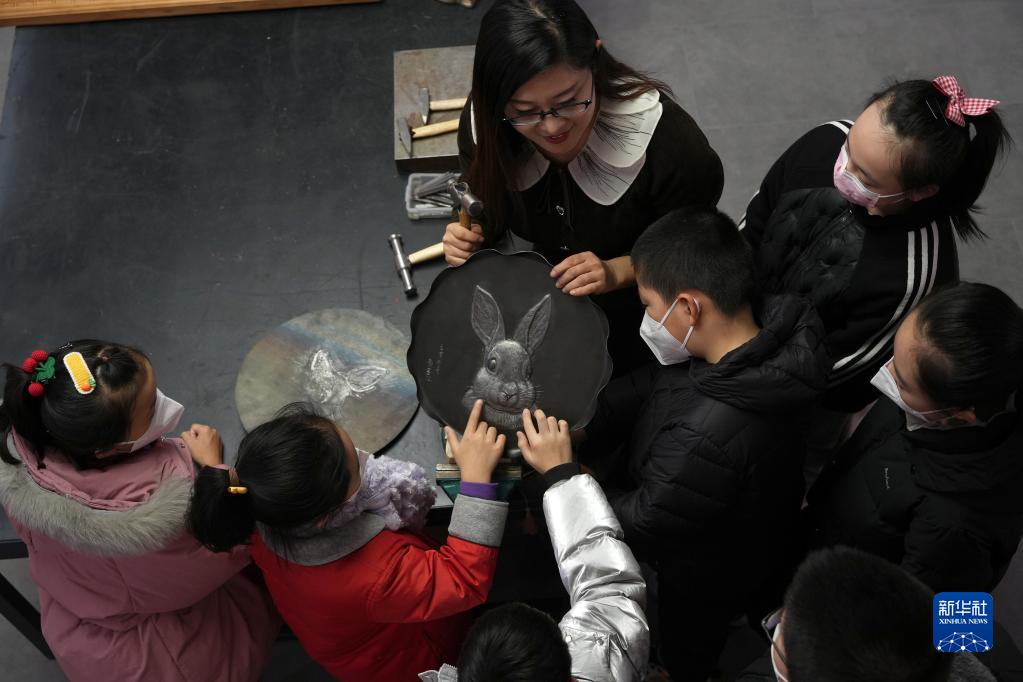1月12日,在石家庄市新华区一个文化工作室,一名铁板浮雕艺人向小朋友展示生肖兔作品。