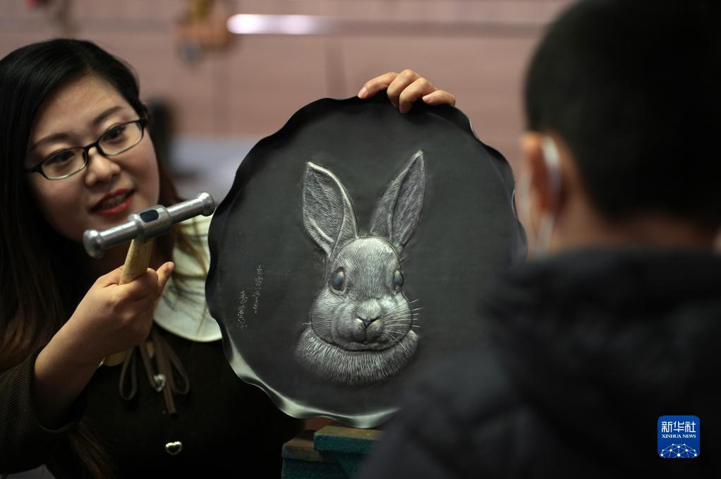 1月12日,在石家庄市新华区一个文化工作室,一名铁板浮雕艺人向观众展示生肖兔作品。