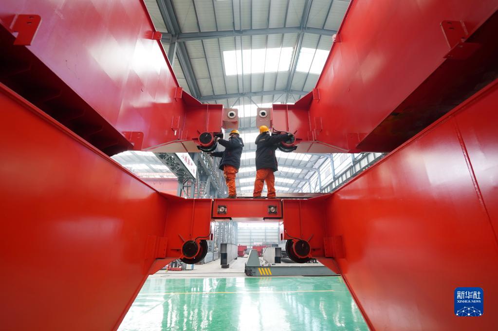 2月14日,工人在唐山市丰润区一家起重设备制造企业的生产车间工作。