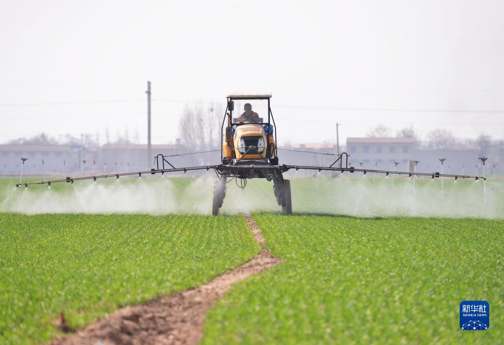3月14日,河北省晋州市槐树镇北白水村一家农业合作社的社员在操作机械设备给冬小麦喷洒农药。