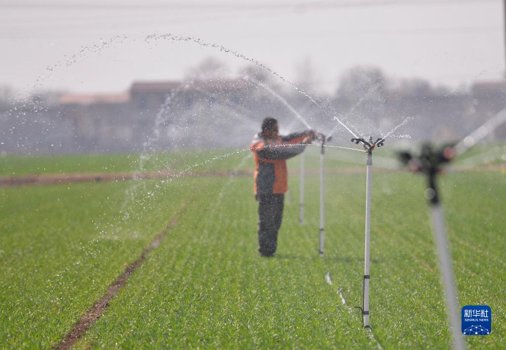 3月14日,河北省晋州市槐树镇北白水村一家农业合作社的社员在田间使用喷灌设备给冬小麦浇水。