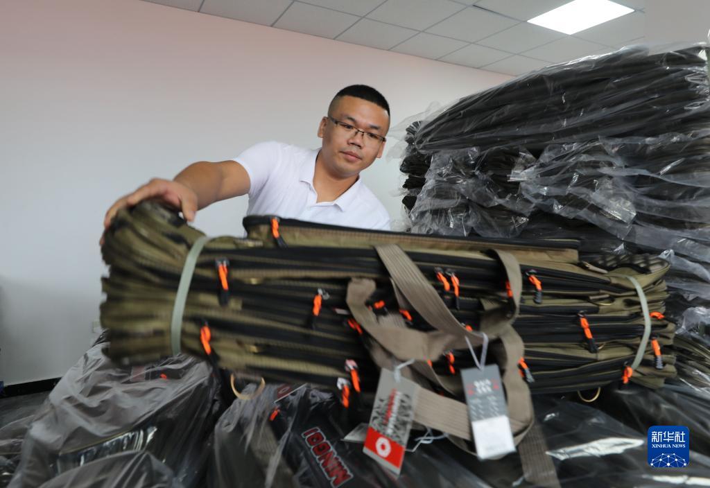 8月15日,在固安县马庄镇一家箱包加工点,一名工人在码放加工好的渔具包。