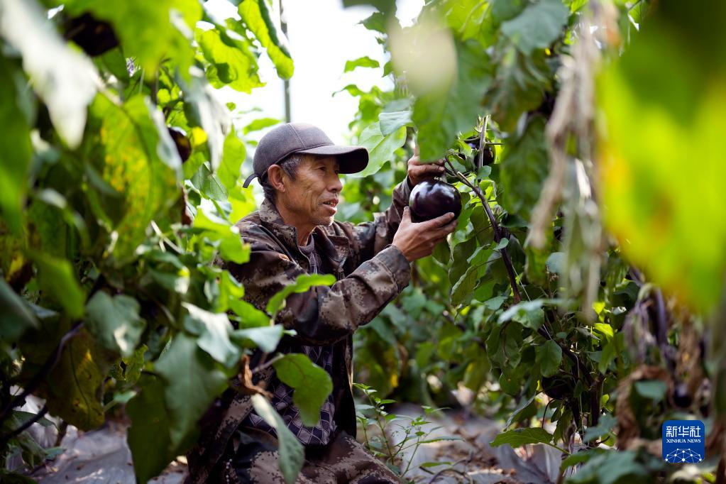 3月15日,河北省乐亭县一家农业开发企业的工人在大棚内采摘茄子。