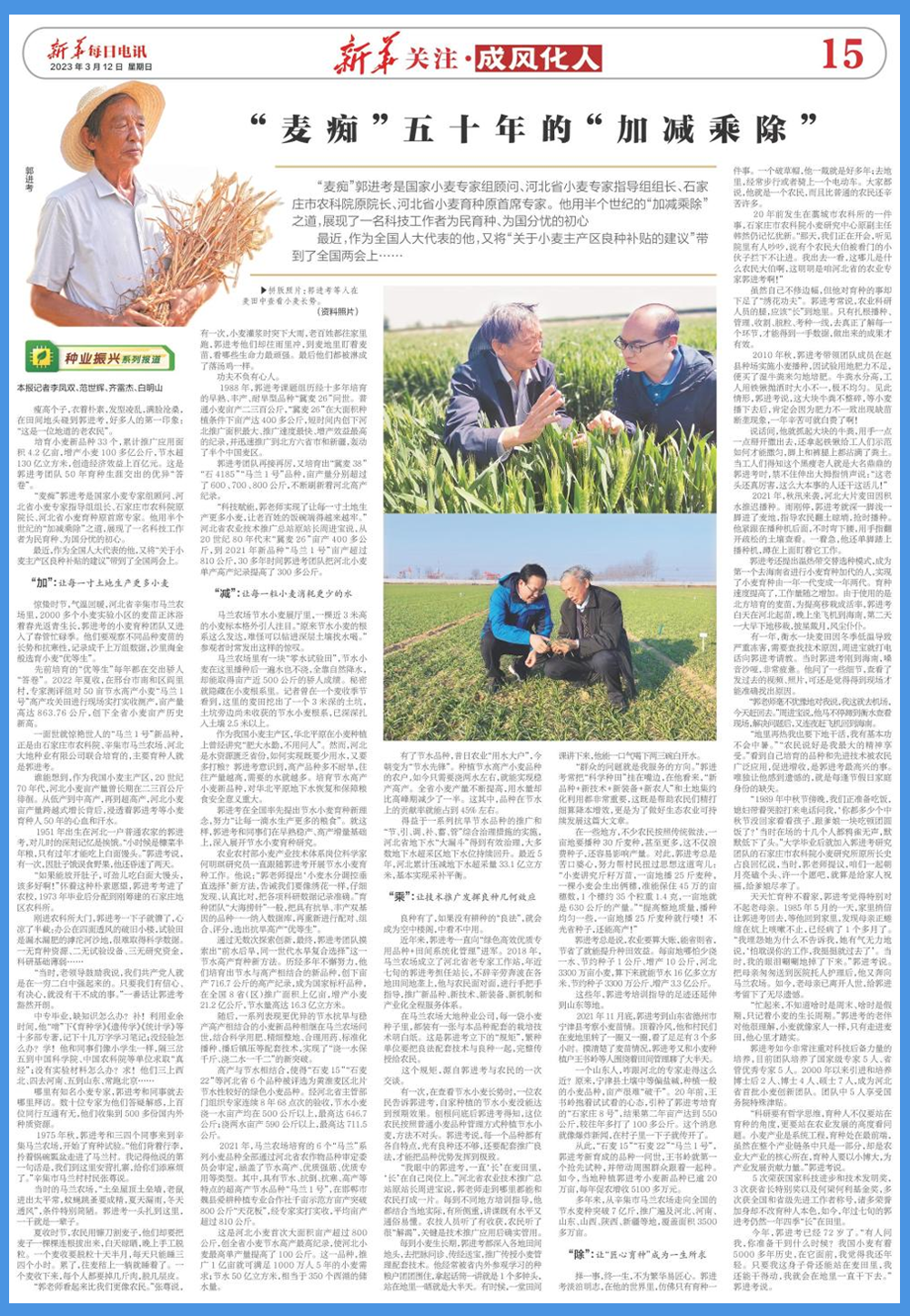 培育小麦新品种33个,累计推广应用面积4.2亿亩,增产小麦100多亿公斤,节水超130亿立方米,创造经济效益上百亿元。这是郭进考团队50年育种生涯交出的优异“答卷”。(新华社记者李凤双、范世辉、齐雷杰、白明山)