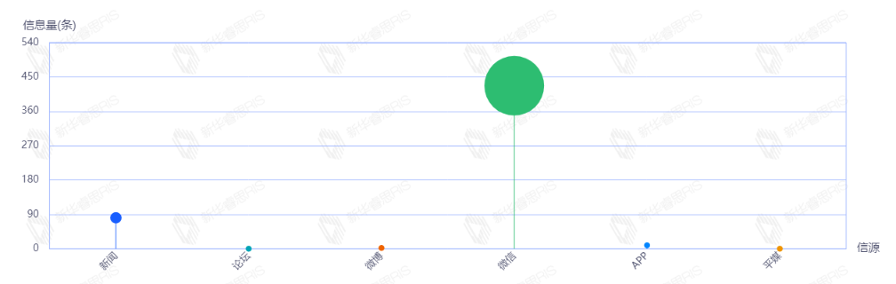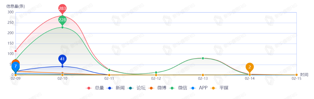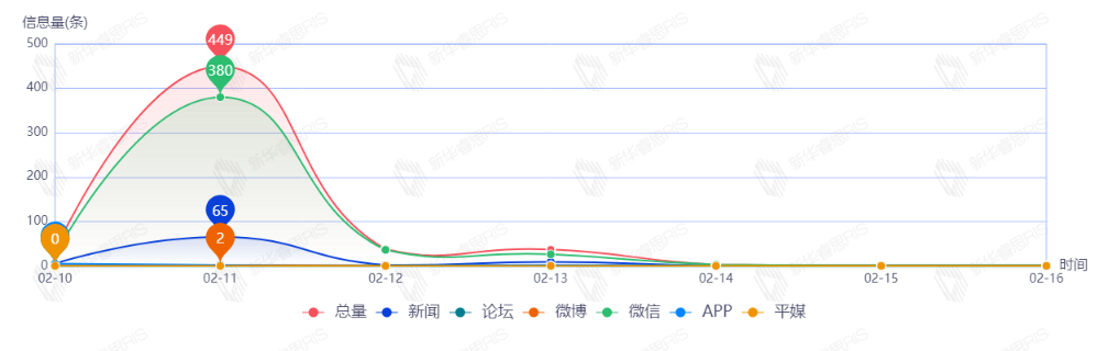 自2月10日首发至2月16日一周内,该文章在互联网上传播总量为563篇。其中2月11日是信息发布的高峰期,发布信息量为449篇文章。各信源的信息发布情况中,微信信息占比最大,其次是新闻和app,信息量分别为427、81、9,占比分别为82.27%、15.61%、1.73%。(数据来源:新华睿思数据云图分析平台)