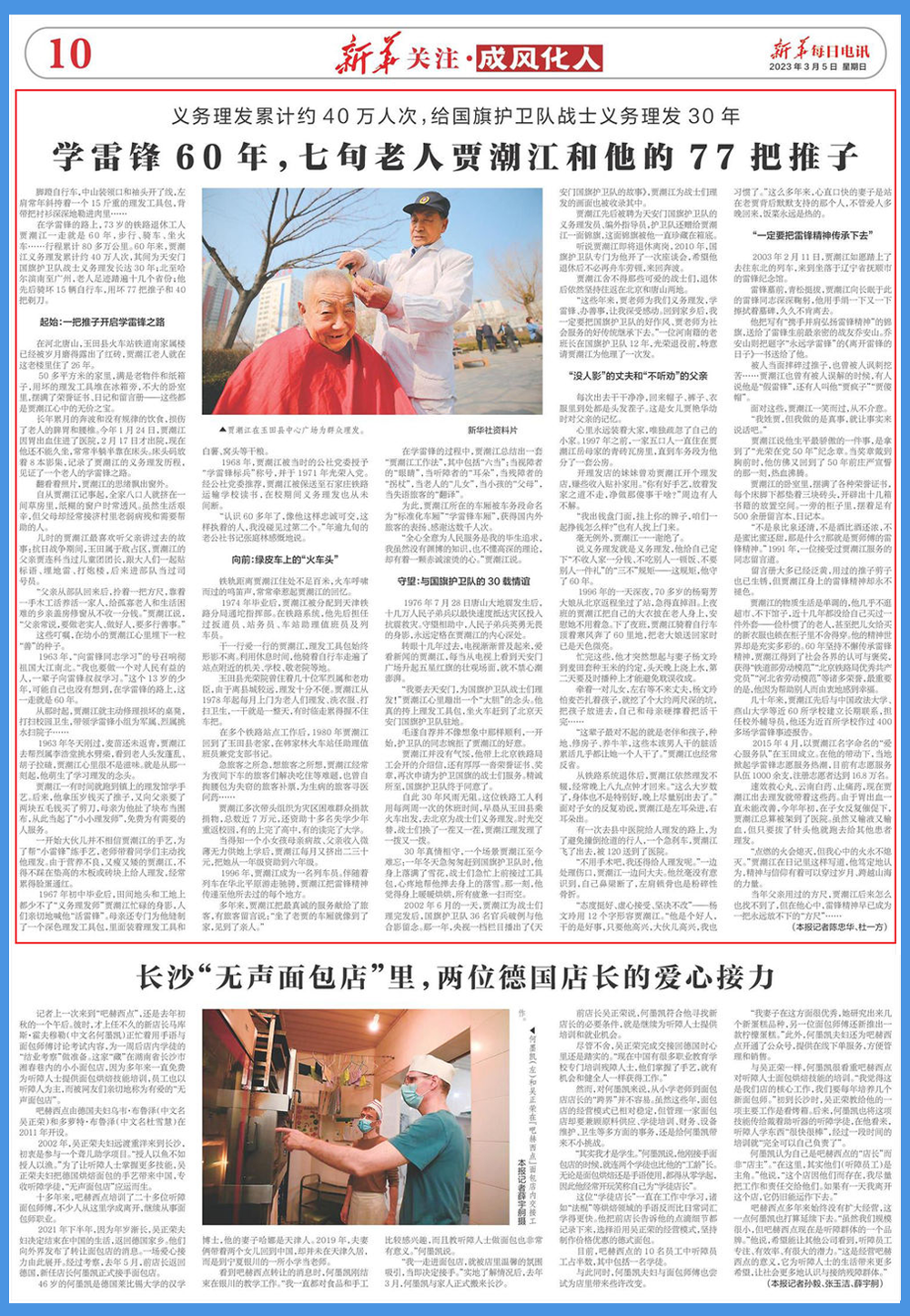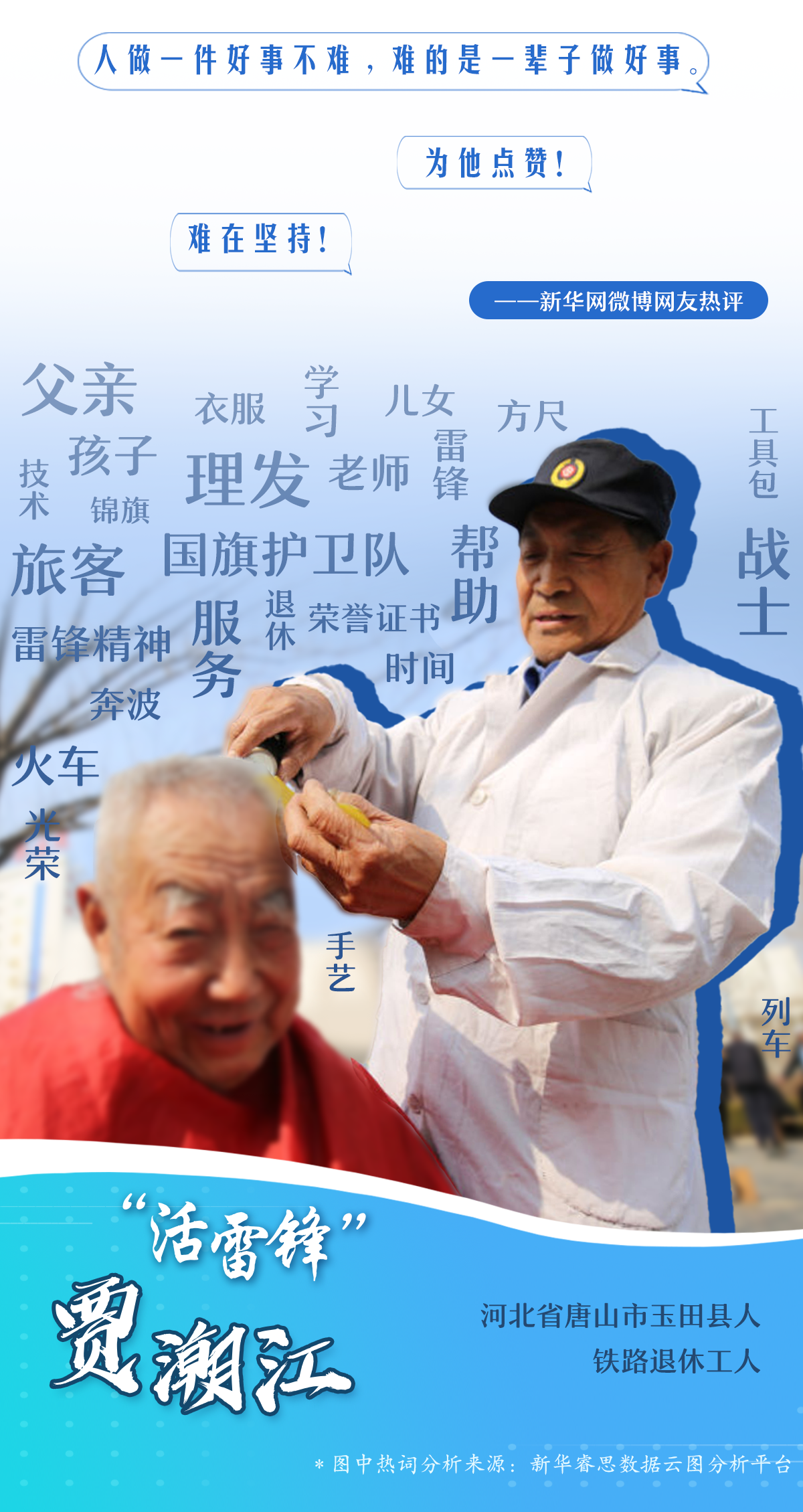 在学雷锋的路上,73岁的铁路退休工人贾潮江一走就是60年,步行、骑车、坐火车……行程累计80多万公里。60年来,贾潮江义务理发累计约40万人次,其间为天安门国旗护卫队战士义务理发长达30年;北至哈尔滨南至广州,老人足迹踏遍十几个省份;他先后骑坏15辆自行车,用坏77把推子和40把剃刀。(新华社记者陈忠华、杜一方)