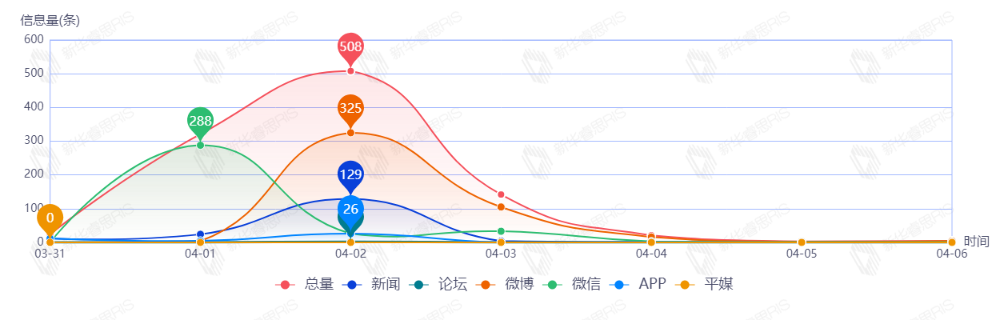 自3月31日首发至4月6日一周内,该文章在互联网上传播总量为1024篇。其中4月2日是信息发布的高峰期,发布信息量为508篇文章。各信源的信息发布情况中,微博信息占比最大,其次是微信和新闻,信息量分别为456、352、170,占比分别为44.53%、34.38%、16.60%。(数据来源:新华睿思数据云图分析平台)