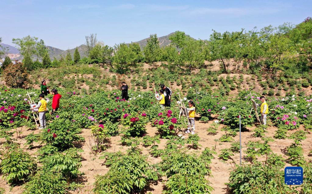 4月16日,老师带领小朋友在白台峪村牡丹农业产业园内写生(无人机照片)。