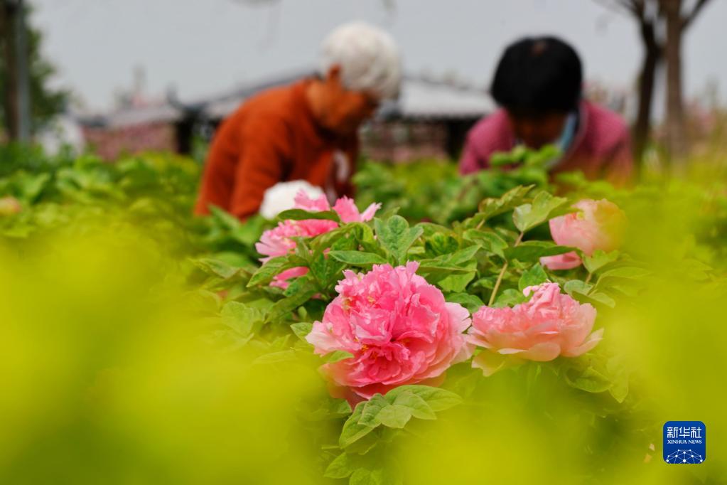 4月17日,河北省柏乡县十里铺村花农在牡丹种植园里采摘牡丹鲜切花。