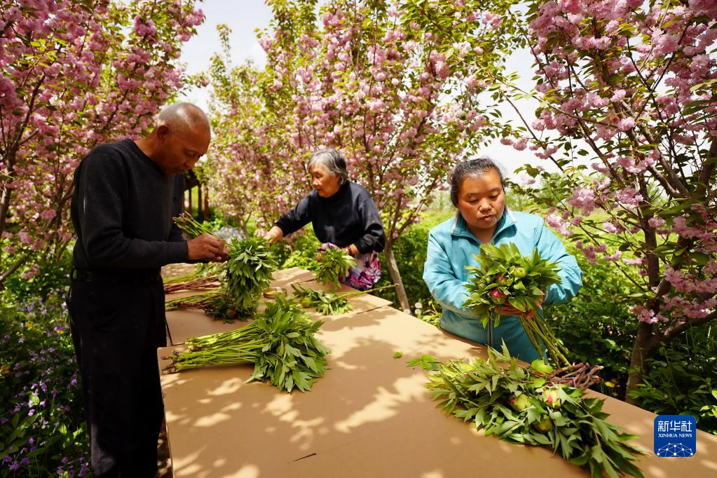 4月17日,河北省柏乡县十里铺村花农在整理刚刚采摘的牡丹鲜切花。