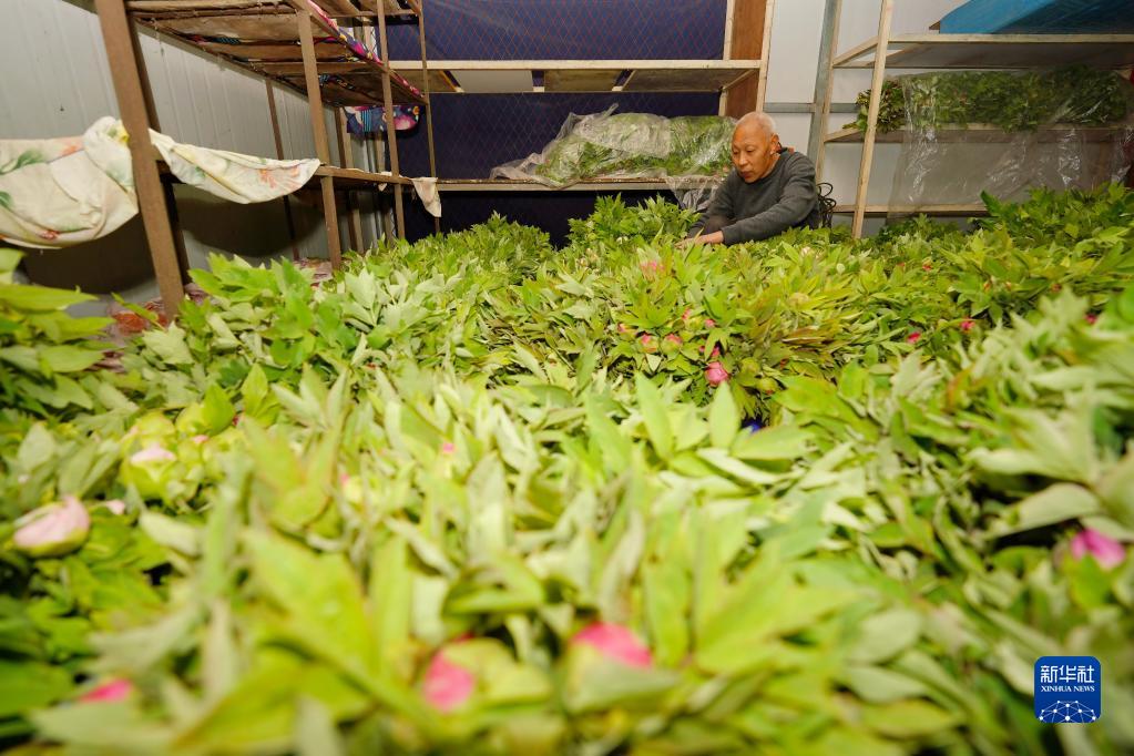 4月17日,河北省柏乡县十里铺村花农整理采摘的牡丹鲜切花,准备储存。