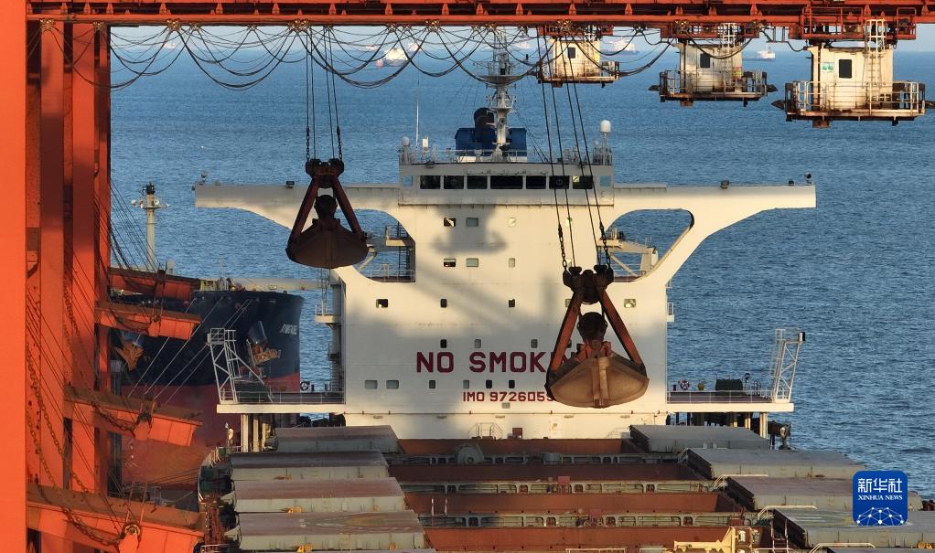 一艘轮船靠泊在唐山港曹妃甸港区矿石码头卸货(7月18日摄,无人机照片)。