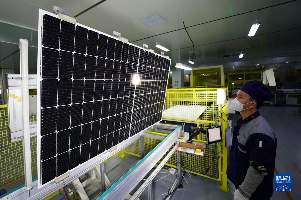 12月19日,位于河北邢台经济开发区的晶澳(邢台)太阳能有限公司工人在检测太阳能组件质量。