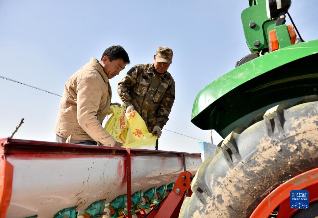 3月19日,河北省邢台市南和区贾宋镇宁营村农民在麦田为农机添加肥料。
