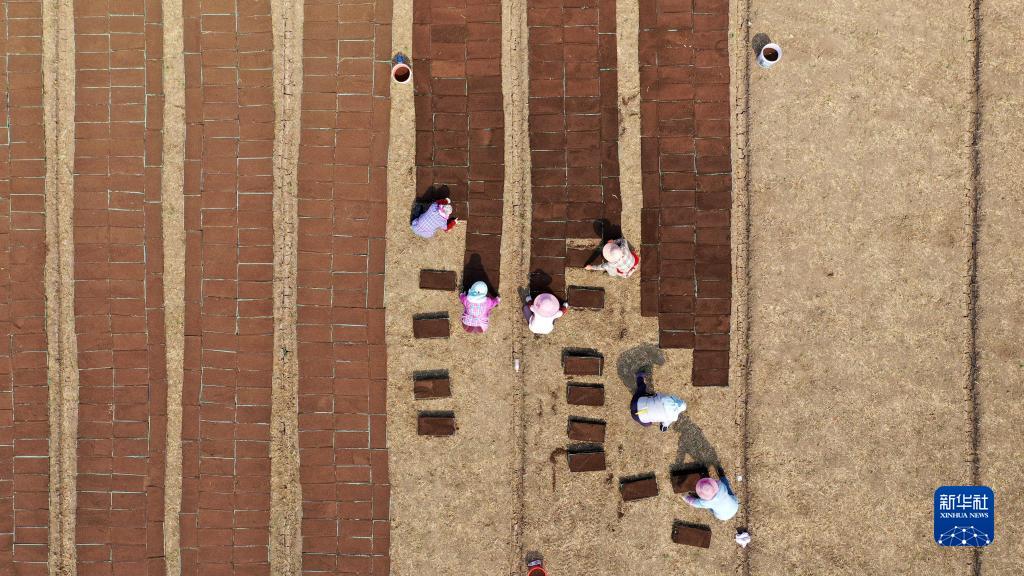 5月20日,在江苏省淮安市洪泽区岔河镇水稻育秧基地,农民在田间摆放育秧盘(无人机照片)。