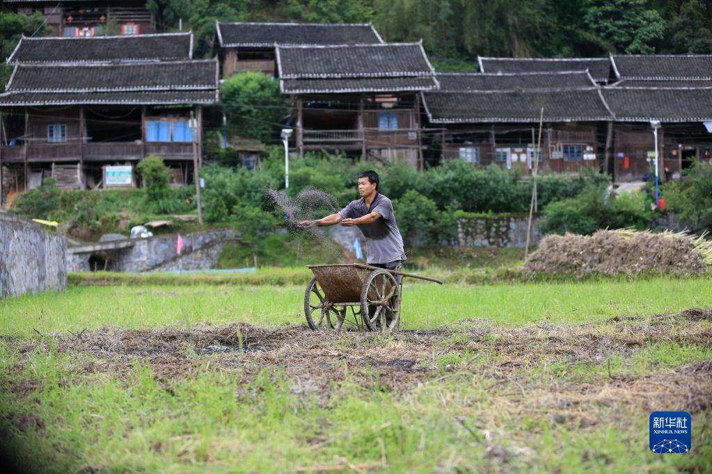 5月20日,农民在贵州省黔东南苗族侗族自治州榕江县寨蒿镇三洲村的田间施肥。
