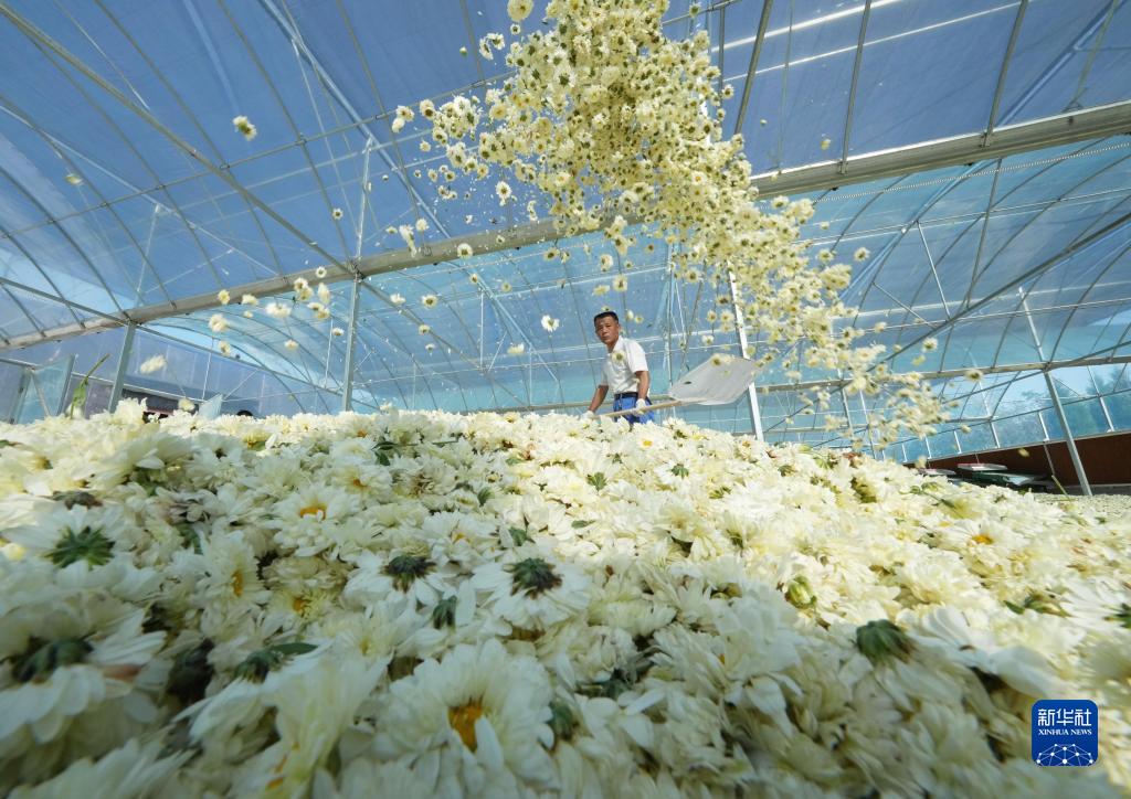9月20日,石家庄市井陉矿区贾庄镇中药材加工企业工人在晾晒太行白菊。