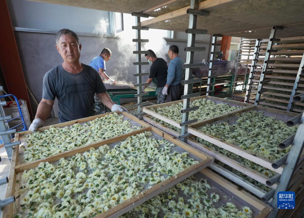 9月20日,石家庄市井陉矿区贾庄镇中药材加工企业工人将太行白菊装盘烘干。