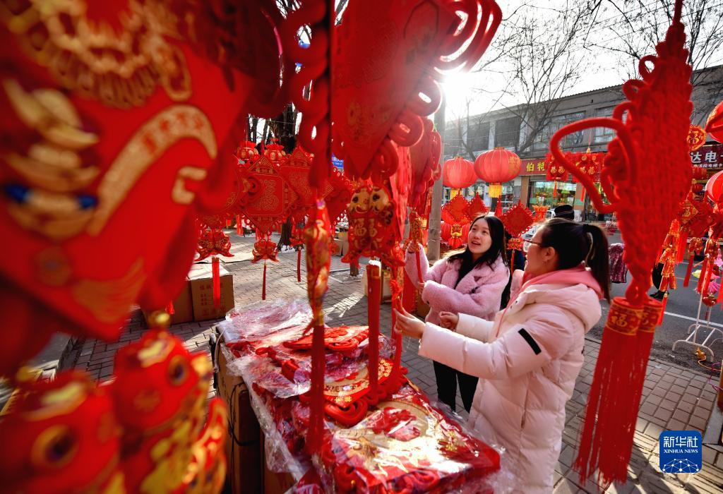 春节将至,在河北省邢台市南和区的年货集市,不少市民选购节庆饰品、春联、福字等年货,迎接新春佳节的到来。