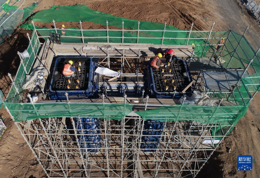 2月20日,中交路桥建设有限公司的工人在石家庄市新华区境内的北三环市政化改造项目建设工地施工(无人机照片)。
