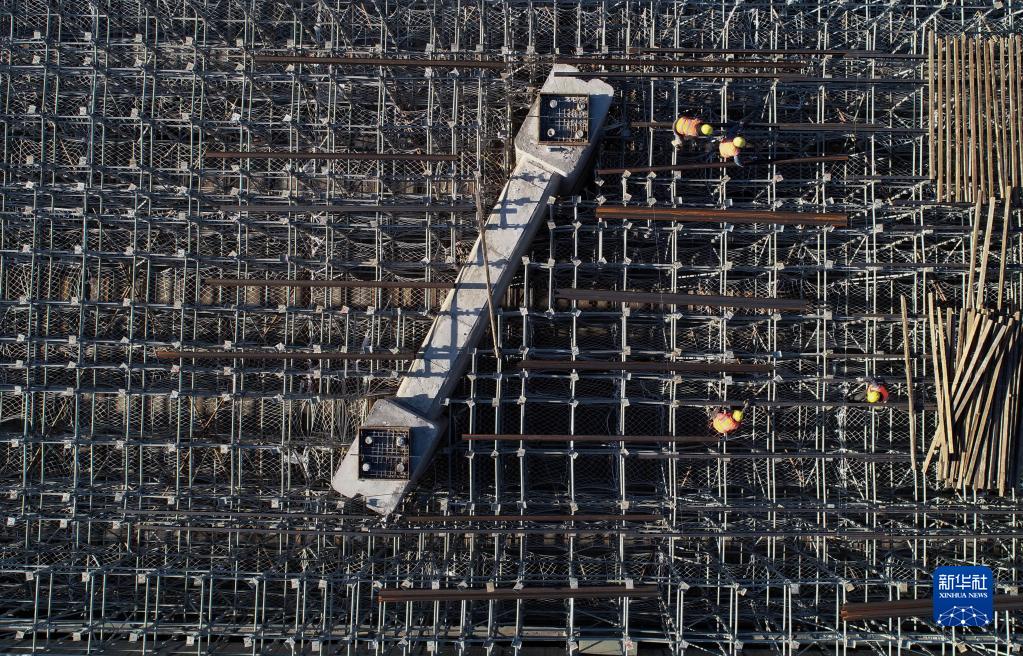 2月20日,中交路桥建设有限公司的工人在石家庄市新华区境内的北三环市政化改造项目建设工地施工(无人机照片)。
