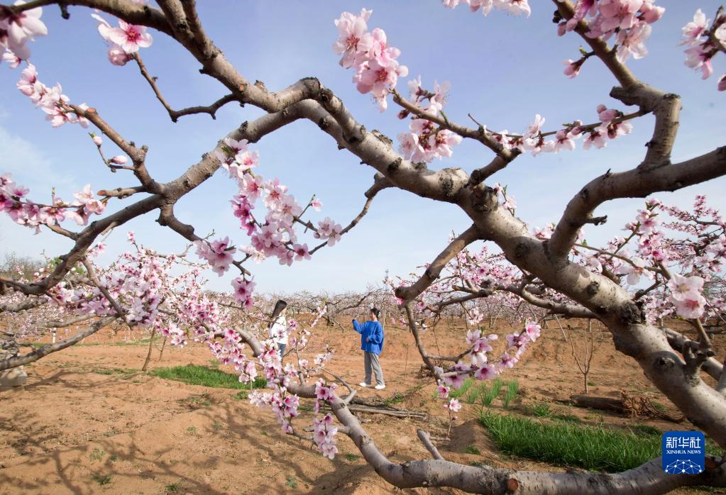 4月19日,游客在秦皇岛市山海关区孟姜镇一处桃园内拍照。