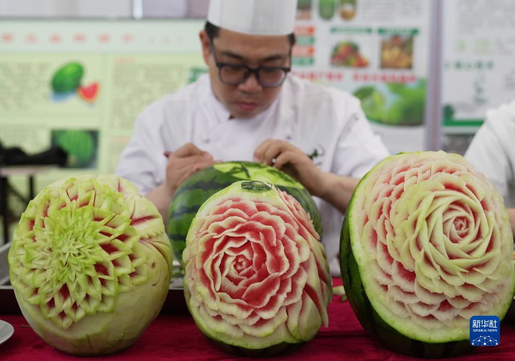 5月20日,一位厨师在展示西瓜雕刻技艺。
