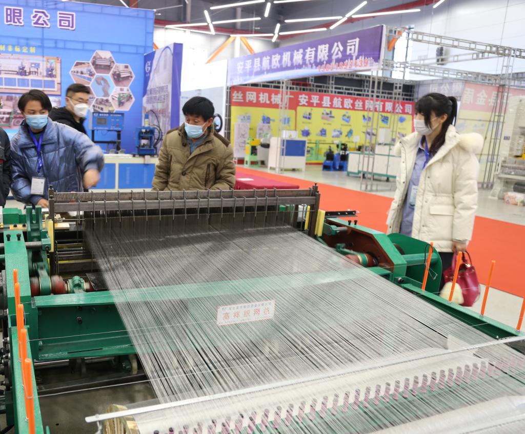 参展商在为客户介绍丝网机械设备。(安平县委宣传部供图)