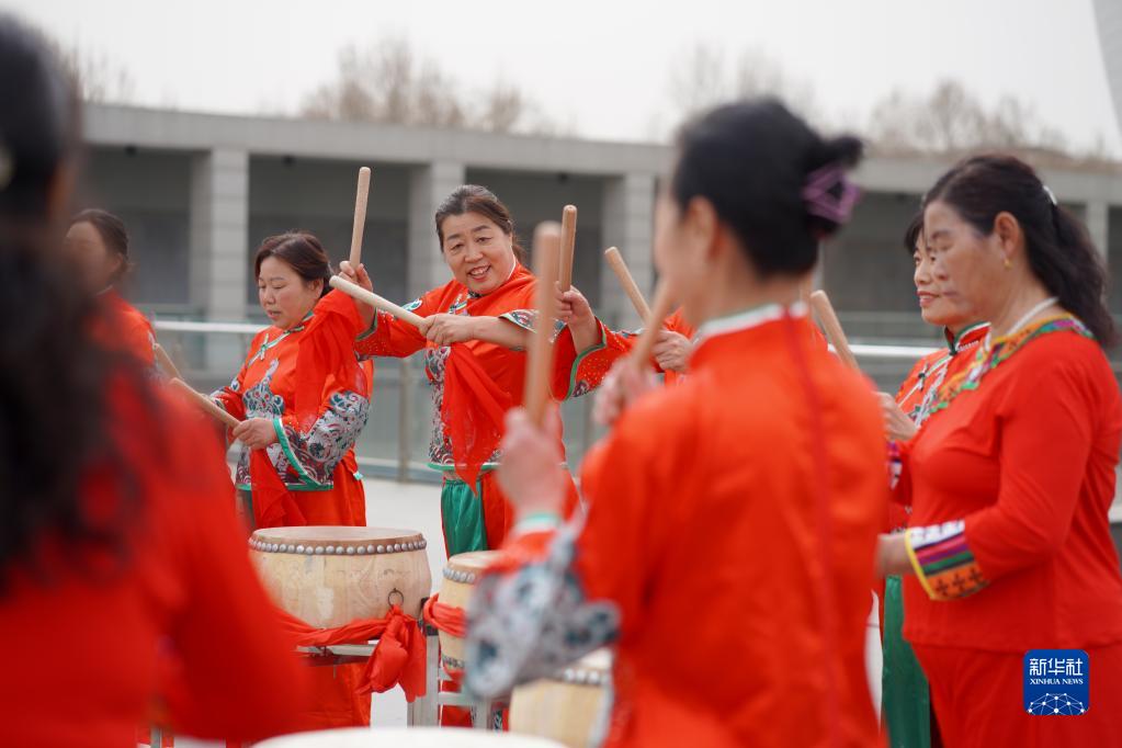 3月23日,群众在内丘县邢窑博物馆广场学习庆源排鼓。
