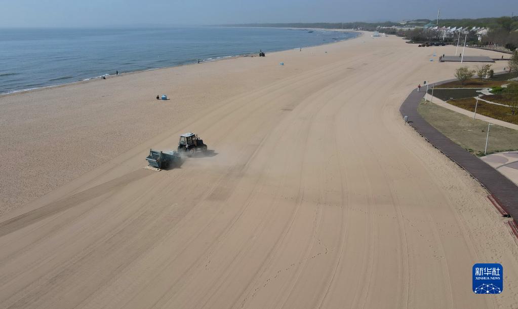 4月23日,工人在秦皇岛市海港区金梦海湾浴场使用机械设备过滤海滩上的沙子(无人机照片)。