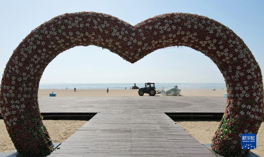 近日,旅游胜地河北省秦皇岛市各浴场的工人开始对浴场的沙滩进行整理,精筛细沙,检修旅游设备,准备迎接八方来客。
