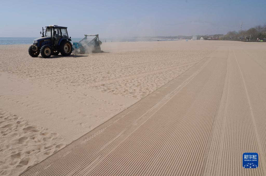 4月23日,工人在秦皇岛市海港区金梦海湾浴场使用机械设备过滤海滩上的沙子。