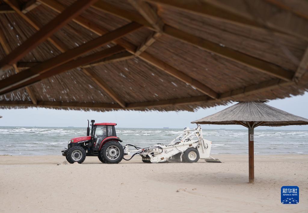 近日,旅游胜地河北省秦皇岛市各浴场的工人开始对浴场的沙滩进行整理,精筛细沙,检修旅游设备,准备迎接八方来客。