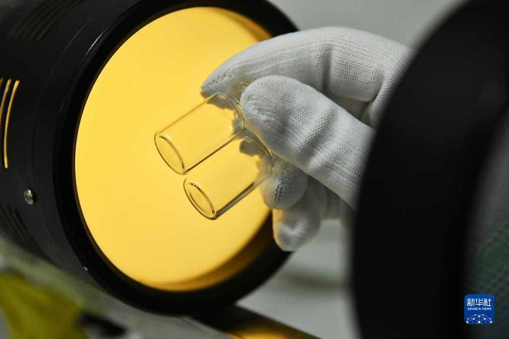 5月24日,工人在沧县一家药包材企业的药用中性硼硅玻璃管制瓶车间对产品做应力检测。