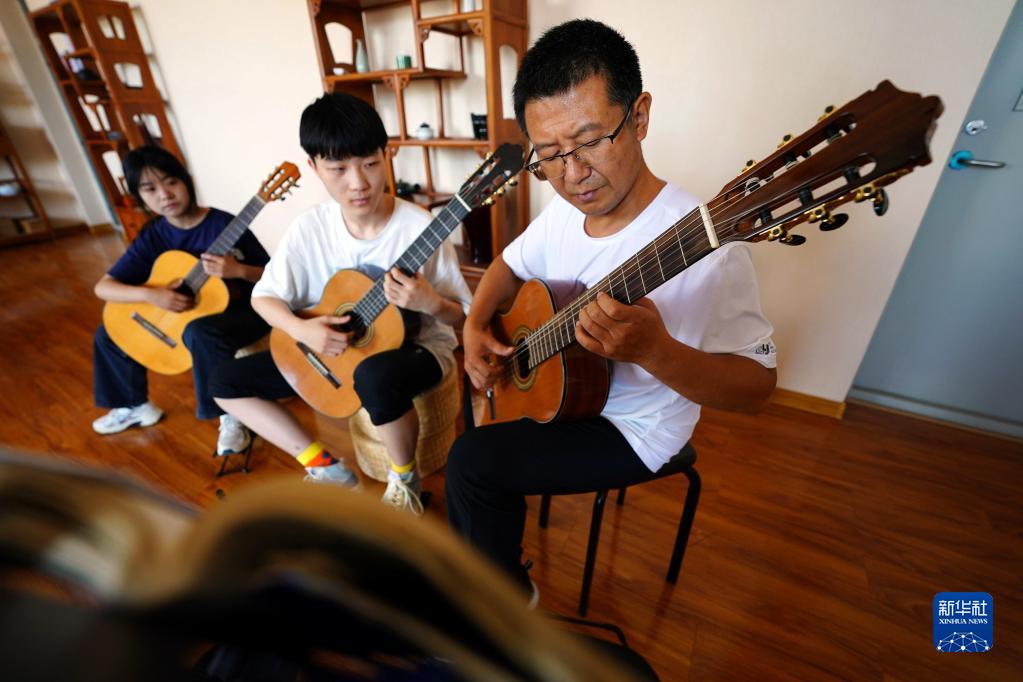 7月24日,在河北省沙河市青少年学生校外活动中心,音乐老师彭英杰(右一)在指导孩子们练习吉他。