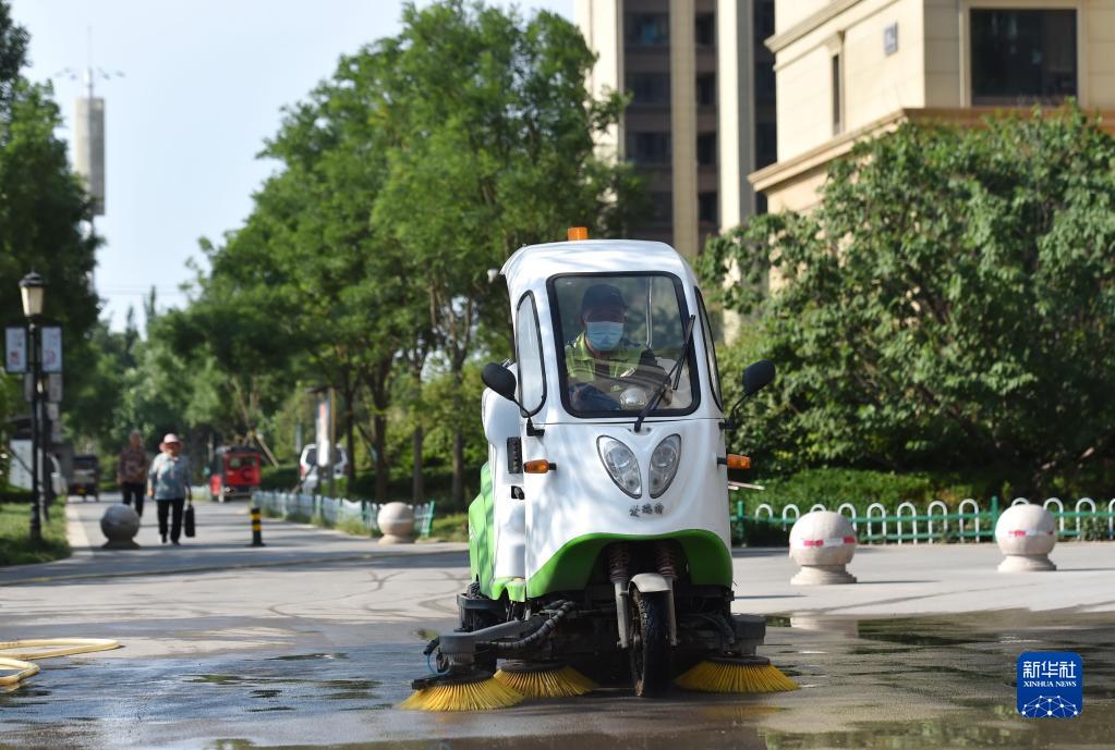 5月24日,石家庄市高新技术产业开发区棚户区改造新建小西帐东苑小区的物业工人在清扫道路。