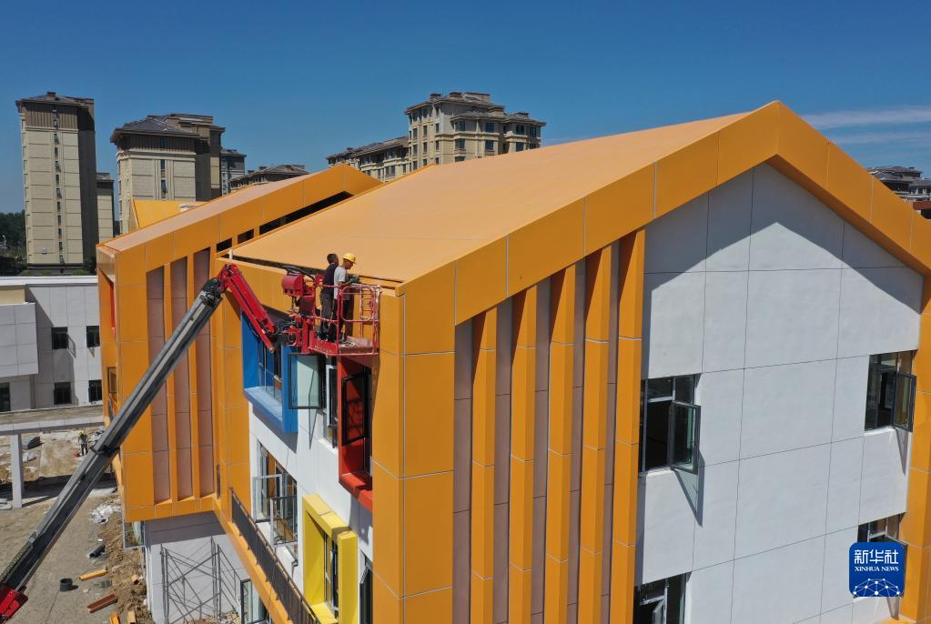 8月25日摄,工人在雄安新区容西片区一学校项目进行施工(无人机照片)。