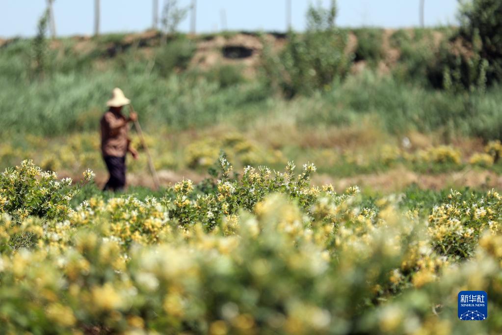 5月26日,工作人员在吴桥县运河“五季”公园对种植的金银花进行田间管理。