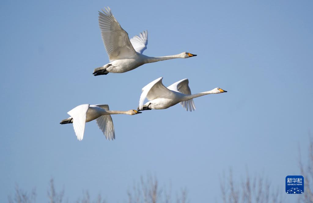 2月25日,天鹅在曹妃甸湿地上空飞翔。
