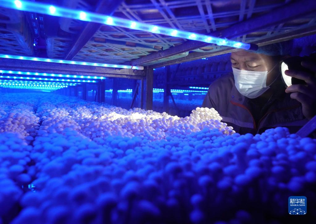 3月25日,河北省昌黎县大蒲河镇一家食用菌企业的工人在食用菌培育车间察看白玉菇的生长情况。