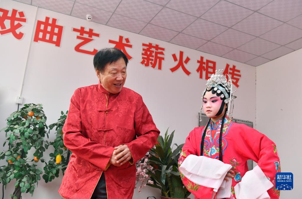 8月28日,在河北省青县“哈哈腔”传承示范基地,非遗传承人刘宗发给小学员说戏。