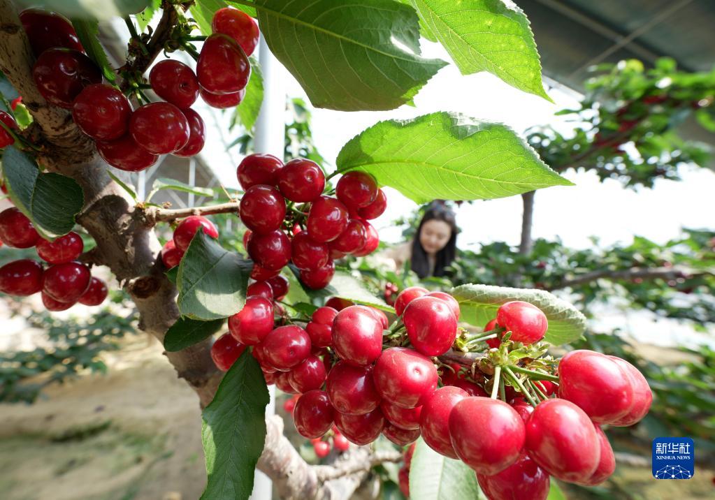 3月28日,游客在秦皇岛市海港区海阳镇常香苑家庭农场的大棚内采摘樱桃。